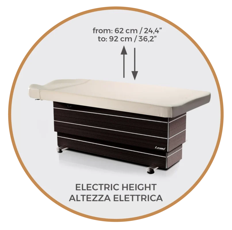 Ліжко Ayurveda V має електричне регулювання висоти за допомогою практичної педалі. Висоту масажного столу можна регулювати від мінімум 62 см до максимум 92 см. Це забезпечує легкий і зручний доступ до гостя, а також дозволяє оператору регулювати ліжко відповідно до своїх потреб, щоб комфортно і правильно проводити процедуру.
